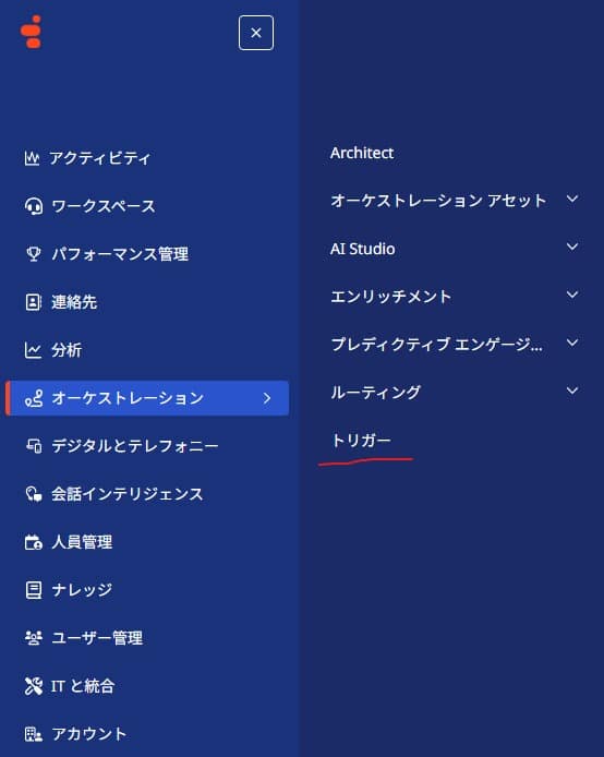 トリガーは、Genesys Cloud 内で発生するイベント(例:通話終了、チャット完了、感情検出など)を契機に、自動でワークフローやアクションを実行する機能です。後処理の自動化、通知送信、外部システム連携などに活用されます。