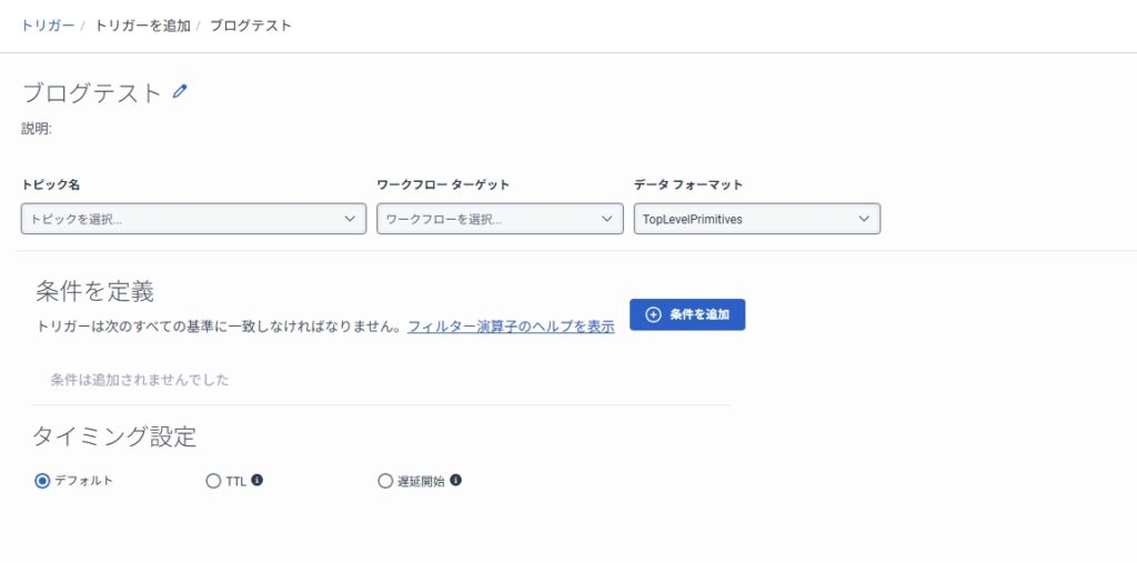 | タイミング | トリガーの発生タイミング。 デフォルト:即時実行 TTL:実行可能な期限 遅延開始:秒数を指定し、その分遅延させ実行させる。 |