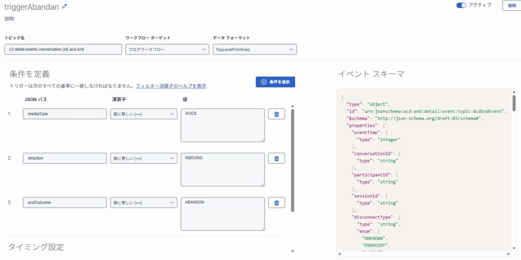 | トピック名 | トピック名は、Genesys Cloud 内で発生するイベントの種類を表す識別子で、トリガーが反応する対象です。 |